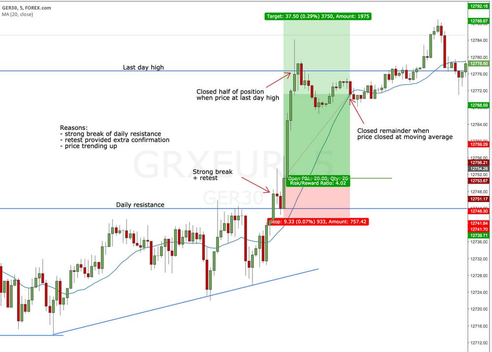 Although entirely optional, a chart screenshot can include information that makes it easier to represent why you took (or didn’t take) the trade. Here’s an example of how such a screenshot might look. Of course, the actual annotations will be different for everyone.