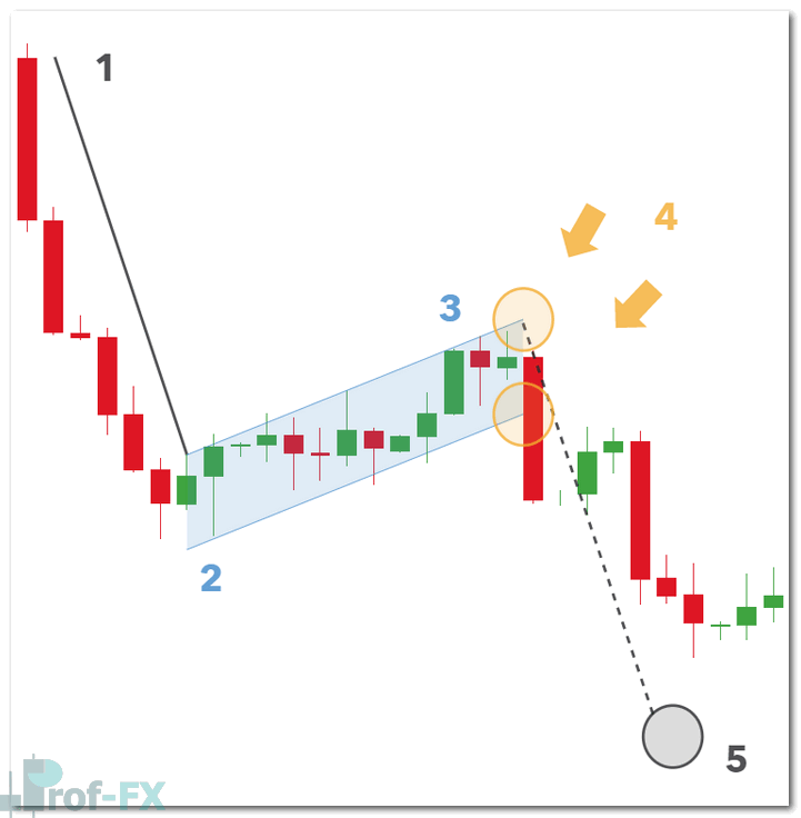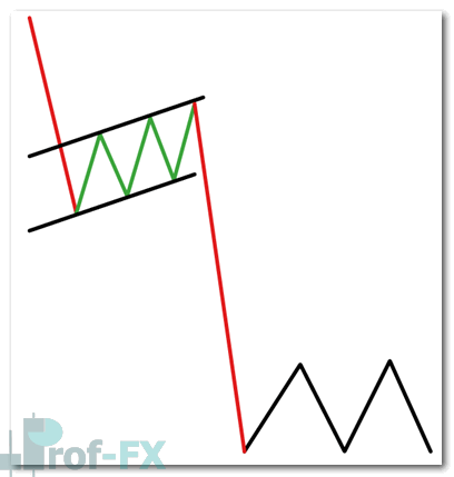 Following this sell-off, price enters a rising consolidation channel—the flag. Importantly, the pattern is not confirmed until price breaks below the lower boundary of the channel.