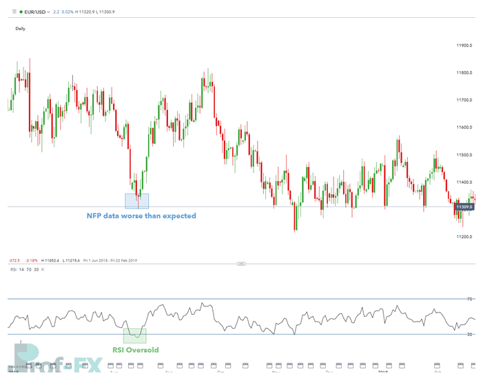 Consider the example involving the RSI indicator during a Non-Farm Payrolls (NFP) release—one of the most influential economic reports affecting the USD.