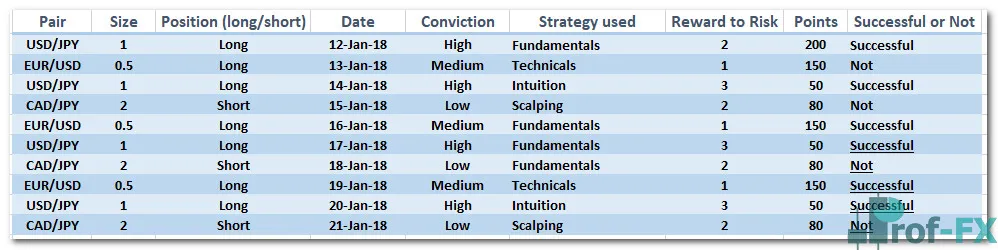 | Currency Pair | Size | Long/Short | Date | Conviction | Strategy Used | Points | Successful? |
