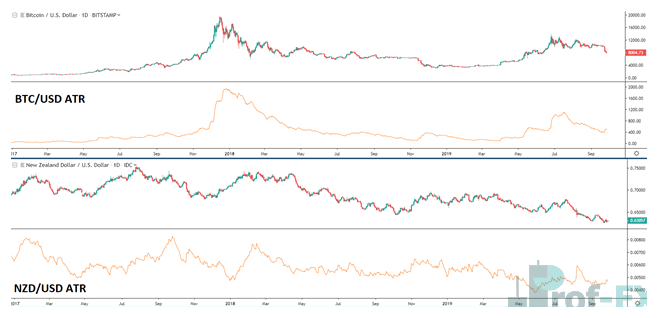 Below is a comparative illustration between BTC/USD and NZD/USD, with ATR applied to both: