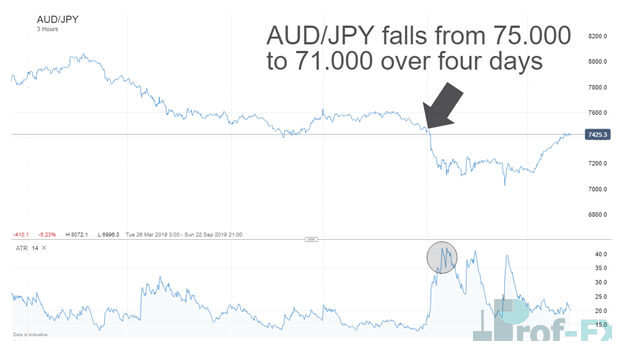 The chart below highlights periods where ATR expanded significantly as price declined sharply: