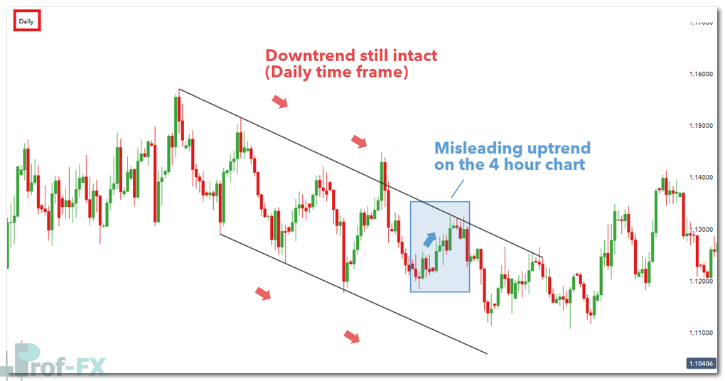 In the example below, the 4-hour chart suggests a potential trend reversal, which may tempt traders to enter prematurely.