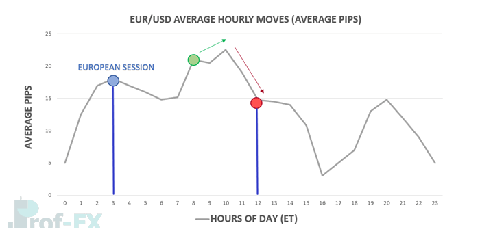 For many major currency pairs, the average hourly price movement increases significantly once the Asian session closes at 3:00 AM ET. This shift is clearly visible on intraday volatility studies, such as those based on EUR/USD.