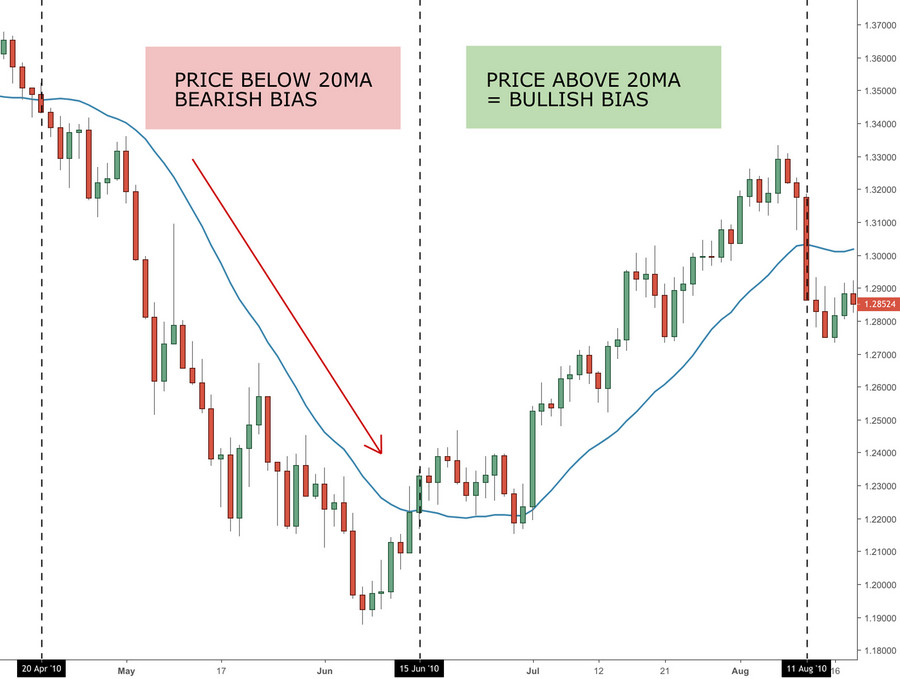 By the way, there is not a single best moving average and it’s far from a magical solution to everything, but popular moving average periods for establishing bias are the 20, 50, 100 and 200. Which one you choose will largely depend on the time horizon for establishing your bias: whereas the 20 moving average will work fine to capture medium-term trend swings, the 200 moving average will be more often used to capture much longer trends.