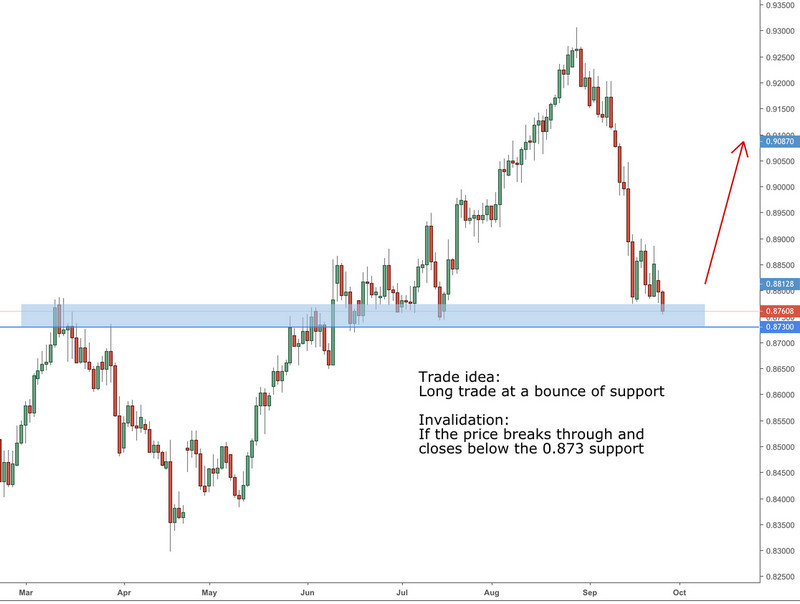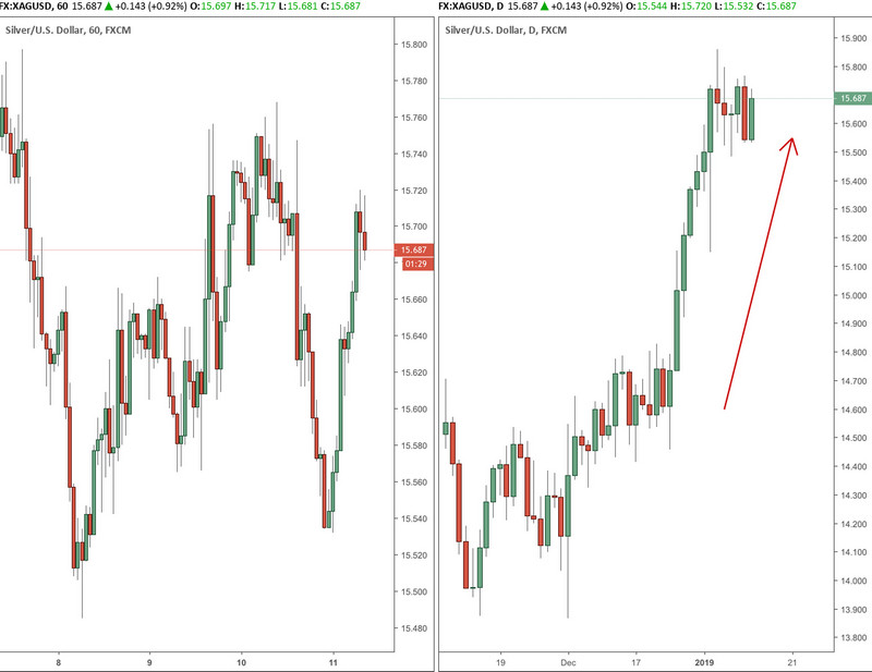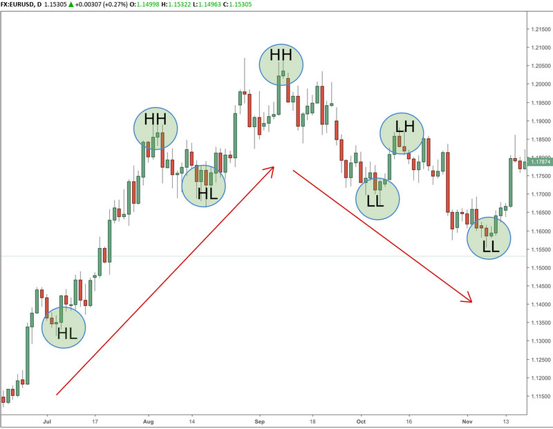 Finally, we can simply look at the general direction of the higher-timeframe charts. If we don’t get a clear picture on the 1H charts, then the 4H or daily charts might show more direction. We simply move up some timeframes and look at whether the price is generally trending up, trending down or stays flat (or ranging). That information can be enough to give us our lower-timeframe bias.