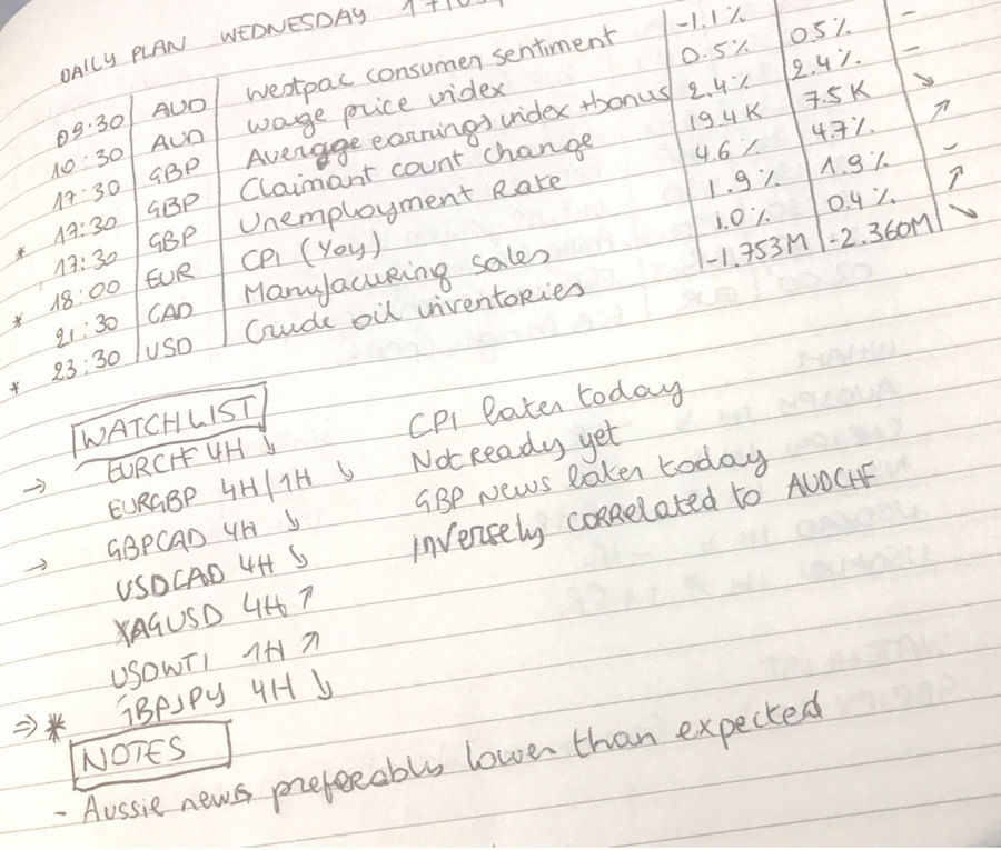 Some of the steps have been formalized into a routine that involves actually writing my observations and requirements down but this isn’t the case for every single step. However, when you just get started with using a similar process, manually writing down every step for every trade might prove very helpful. You want to be clear on what exactly it is that you’re looking for when taking trades.
