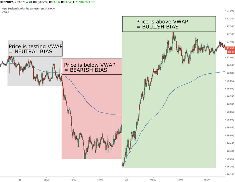 VWAP is an indicator that stands for Volume Weighted Average Price. As an average of volume traded, it works similarly to a moving average. Whenever the price trades below VWAP, we can adopt a bearish bias and whenever the price trades above VWAP, we use a bullish bias.