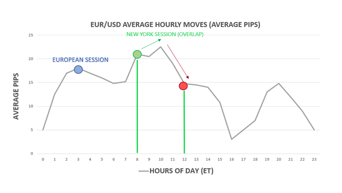 The chart below illustrates how, during the overlap (highlighted between the green vertical lines), the average hourly movement in EUR/USD reaches its highest levels.