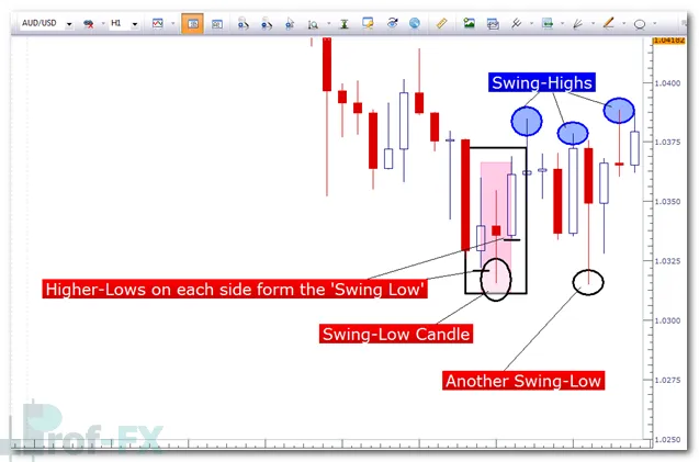 In other words, price makes a low point that is surrounded by higher lows on both sides, indicating rejection of lower prices.