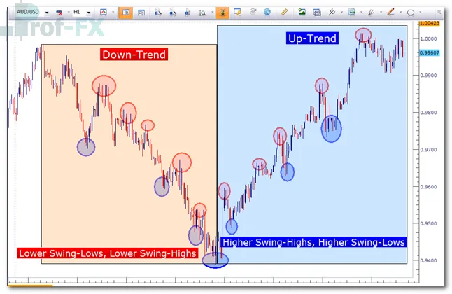 By observing the sequence of swings, traders can objectively determine market direction:
