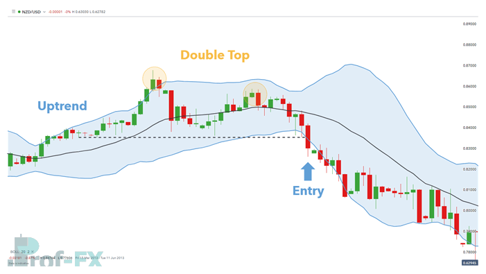 Below is a practical example of a bearish Bollinger Band® reversal on the NZD/USD daily chart.