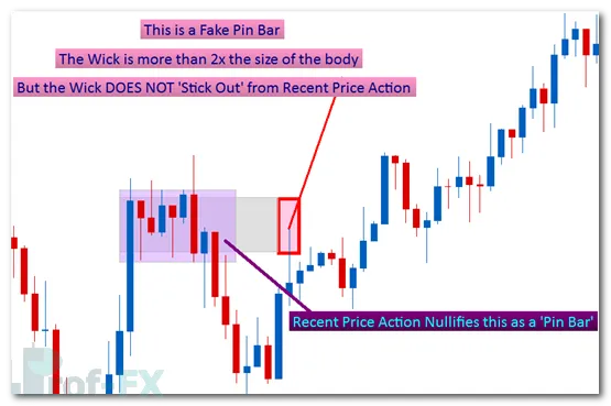 As shown above, the fake pin bar fails to clearly stand out from prior price action, making the reversal signal far less reliable if traded blindly.