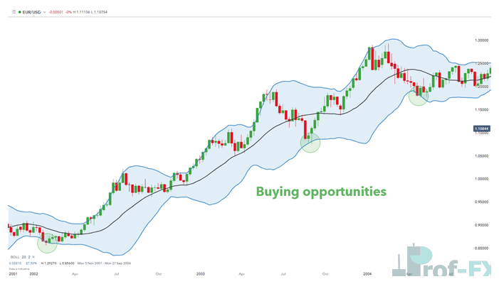 - When price pulls back and touches the lower band, traders look for long (buy) opportunities