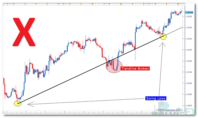 In the first example, although two swing lows are connected, price cuts through the line between those points. This invalidates the trendline.