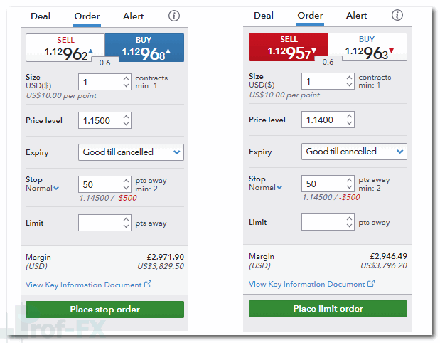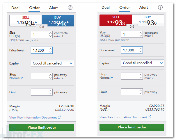 - Sell EUR/USD at 1300, target 100 pips profit → buy limit at 1.1200