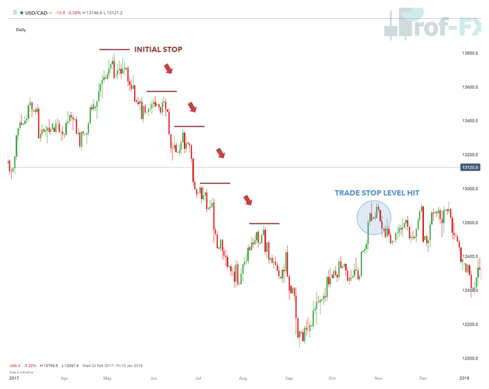 The example below illustrates a short position where the trader moves the stop loss lower as price continues to make lower highs. When the trend eventually reverses, the trade is closed by the adjusted stop.
