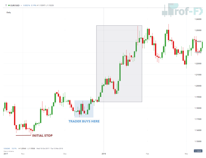 For example, a trader buys EUR/USD at 1.3100 with an initial stop at 1.3050. The trader sets a trailing stop to adjust every 10 pips: