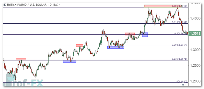 In the example below, a Fibonacci retracement is applied to GBP/USD, using the June 2016 high at 1.5006 and the October 2016 low near 1.1950, following the Brexit-driven sell-off.