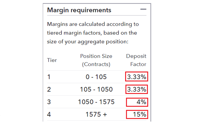 As trade size increases, traders may move into higher margin tiers, where the monetary margin requirement increases. In many cases, the first tiers may share the same percentage requirement, before escalating at higher exposure levels.